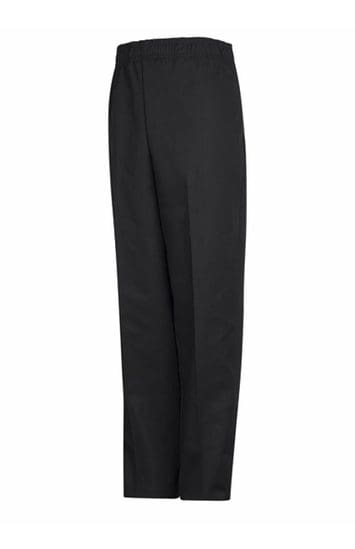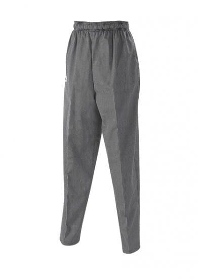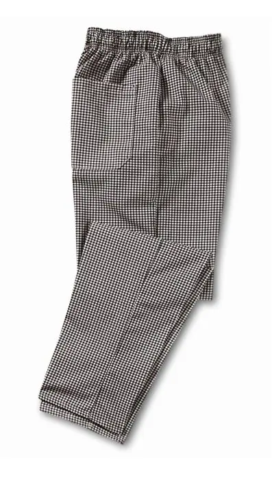 This chef pant is baggy for a relaxed fit. It has a pre-cure finish to keep you looking sharp and features an elastic waist and drawstring closure for added comfort.